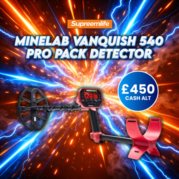 Discover hidden treasures with the Minelab Vanquish 540 Pro Pack — the ultimate metal detector for adventurers and treasure hunters! Designed for accuracy, depth, and simplicity, it’s packed with cutting-edge Multi-IQ tech. Or grab the £400 cash alternative instead!